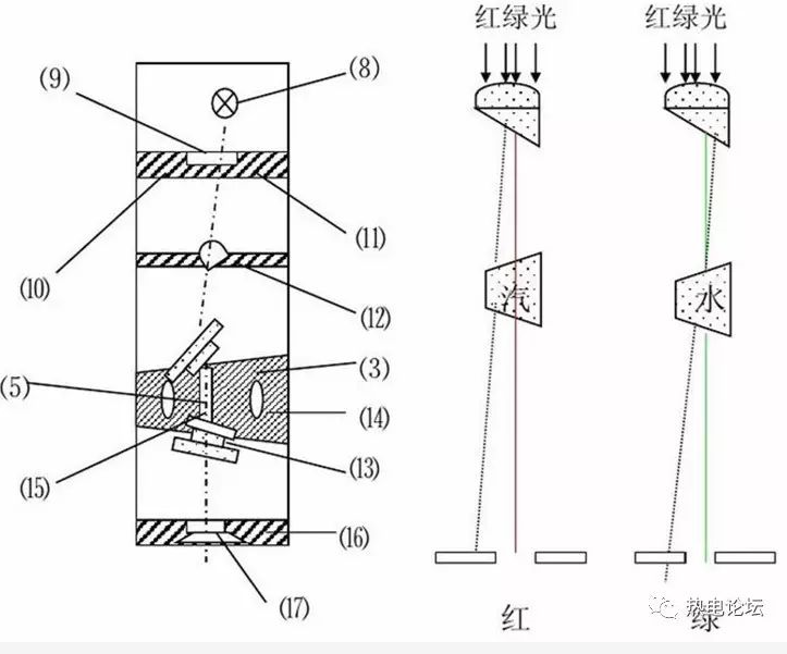 云母雙色水位計是采用連通器原理制成,利用光在不同介質中呈現不同的折射率和反射特性,并借助于濾色片使液相呈綠色,氣相呈紅色來顯示汽包水位的。由燈泡發出的光,通過紅綠濾色片,再通過聚光境射向水位計本體,在水位計本體內,汽相部分紅光射向正前方,而綠光斜射到壁上被吸收;而在本體內液相部分,由于水的折射使綠光射向正前方,而紅光斜射到壁上被吸收,因而在正前方觀測時,可看到水位計顯示氣紅液綠,清晰透明。